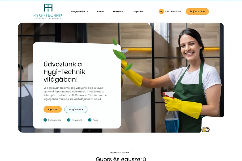 A Hygi-Technik takarítással foglalkozó cég weboldalán a modern és minimalista style találkozik.